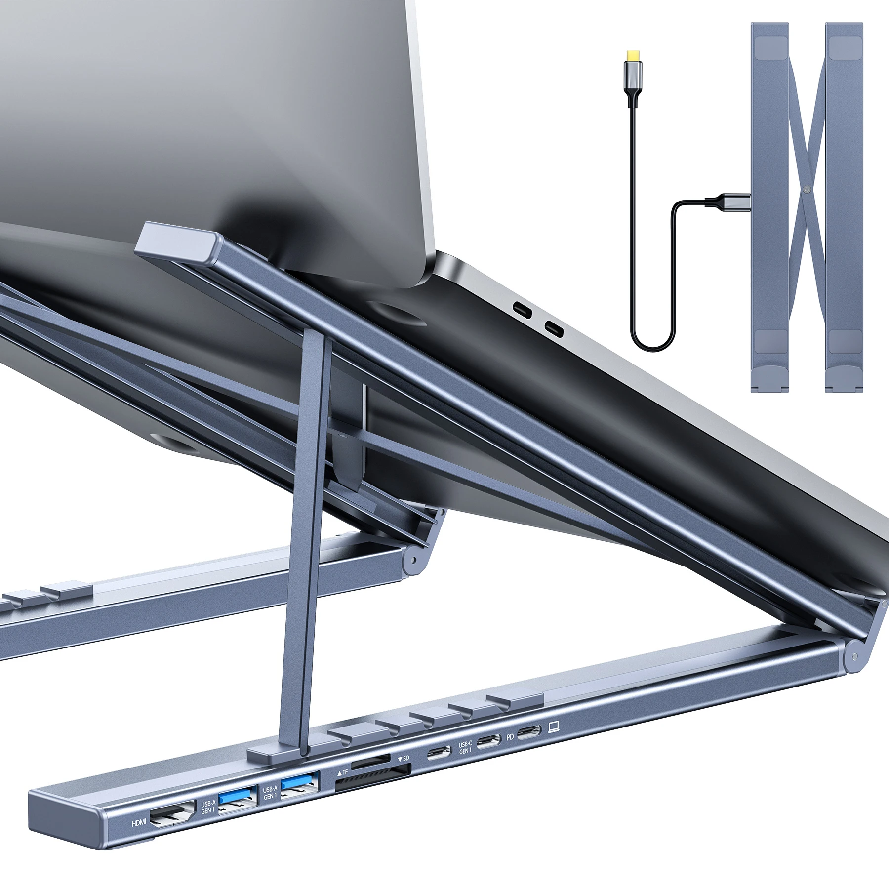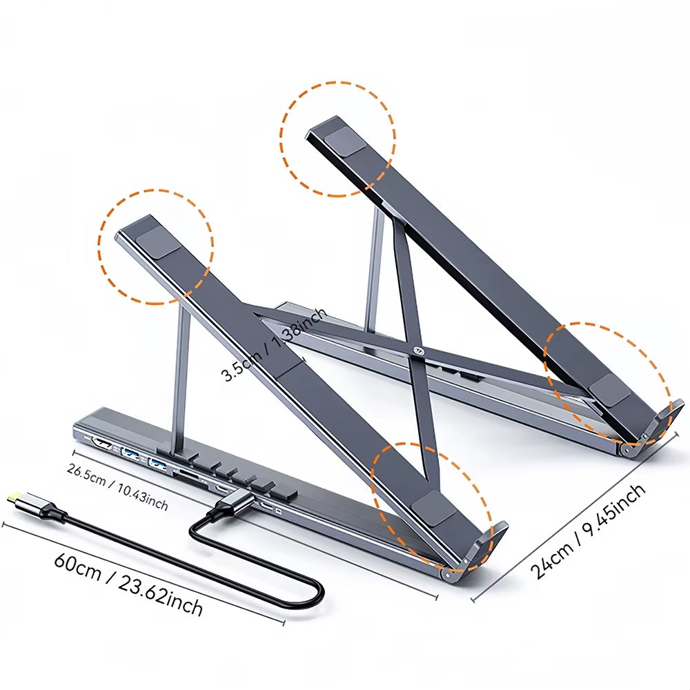 Il sert à étendre les capacités de connexion de votre ordinateur portable en ajoutant plusieurs ports indispensables comme HDMI 4K, USB 3.0, Power Delivery 100 W, lecteurs de cartes SD/TF, etc., tout en supportant votre laptop à hauteur ergonomique